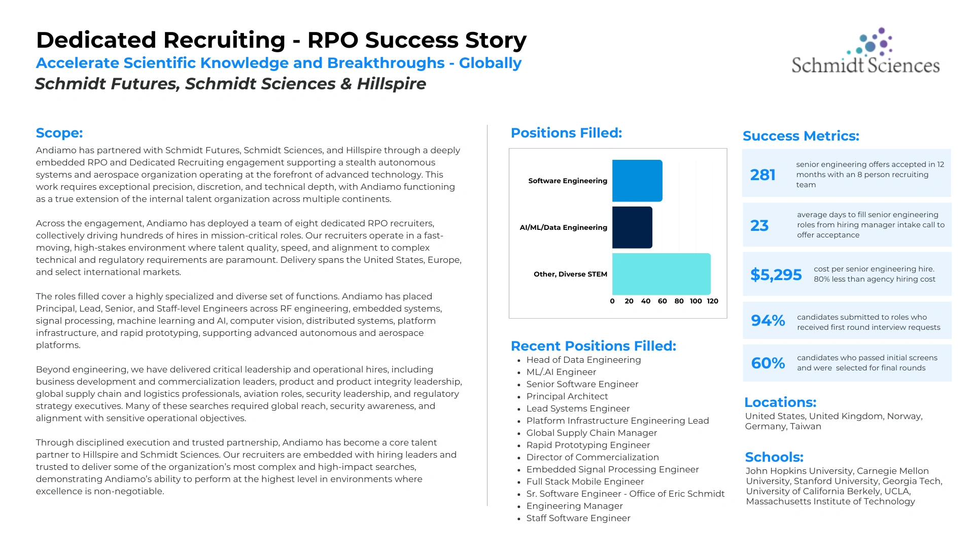Andiamo supports organizations across the healthcare, biotech, and pharmaceuticals fields with deep industry knowledge and a strong network of specialized professionals. We understand the pace of innovation in this sector, and we deliver the people who keep projects moving, programs advancing, and missions succeeding.